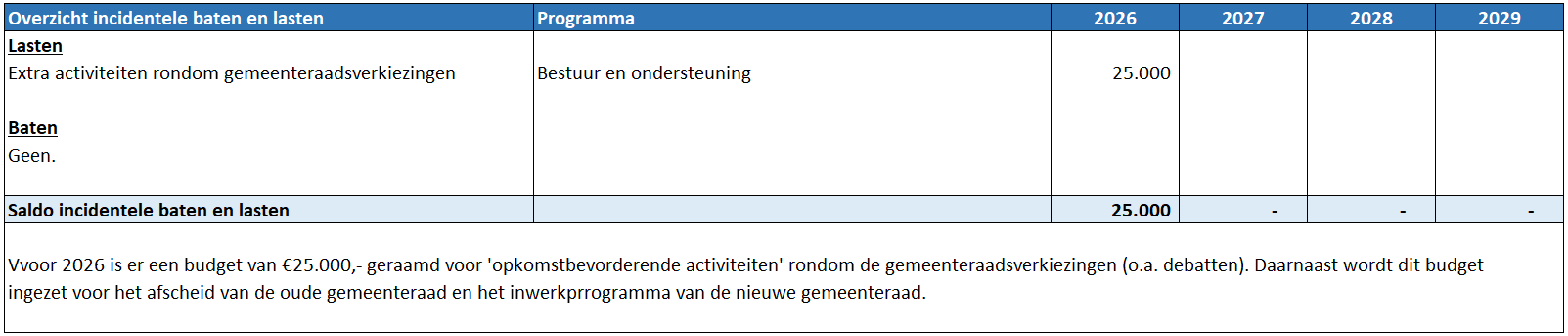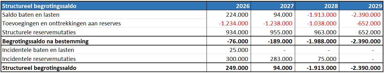 Programma | Lasten 2026 | Baten 2026 | Saldo per programma | Storting reserve | Onttrekking reserve | Saldo na bestemming | |||