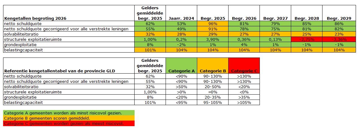 De meerjarige kengetallen zijn redelijk stabiel waarbij opvalt dat de schuldquote is verbeterd en de solvabiliteitsratio op termijn een lichte daling laat zien. De financiële risico’s van de grondexploitaties zijn in vergelijk met andere gemeenten erg laag. Het kengetal van de structurele exploitatieruimte laat voor de jaren vanaf 2028 een negatief zien. De oorzaak is dat het Rijk kortingen heeft toegepast in het gemeentefonds en de gemeente hierdoor ervaart dat er te weinig middelen beschikbaar zijn om de taken goed uit te kunnen voeren. De kengetallen vanaf 2026 zijn wel in positieve zin beïnvloed vanwege de toename van de baten door ook alle SPUK's in de begroting te verwerken. Door een hoger cijfer van de baten valt het percentage gunstiger uit.