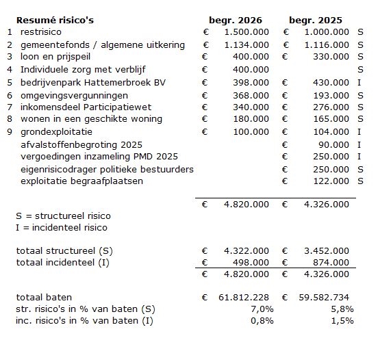 In totaal becijferen we het structurele risico op €4.322.000,- en het incidentele risico op €498.000,-.