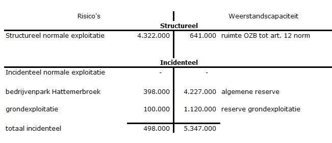 De in deze paragraaf berekende incidentele risico’s zijn €498.000,-. Deze risico’s worden afgedekt door de reserves van tezamen €5,3 miljoen. Zoals het overzicht laat zien is dit ruim voldoende.