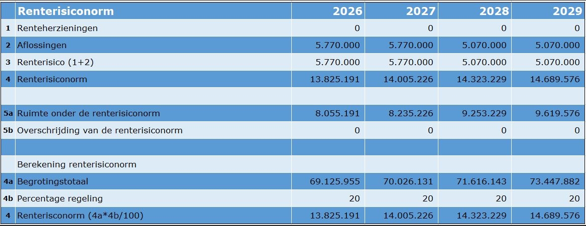 De geraamde reservepositie ten behoeve van de risico's is €5,3 miljoen per 1 januari 2026. Deze reserve is behoorlijk gedaald door een verschuiving naar reserveringen voor gebouwen.