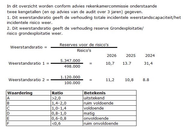 De weerstandsratio is een kengetal dat aangeeft in welke mate de gemeente in staat is om de incidentele risico’s op te vangen. Dit kengetal wordt berekend door de beschikbare weerstandscapaciteit te delen door de benodigde weerstandscapaciteit. Eenvoudig gezegd betekent dit: welk bedrag is berekend aan risico’s en welk bedrag is er om deze risico’s af te dekken. Her weerstandsratio 1 van 2026 daalt vanwege een daling van de algemene reserve. De conclusie van beide kengetallen is dat de risico’s ruim afgedekt worden door de reserves.