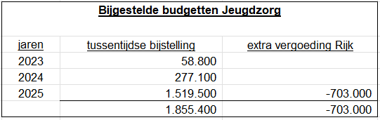 Voor de Jeugdzorg geldt eveneens dat door een toename van de kosten, complexiteit van de zorg en het aantal geïndiceerde jeugdigen er opnieuw moet worden bijgeraamd; voor dit jaar is er €428.000,- extra budget nodig. Gelet op de recente uitspraken van de commissie Van Ark wordt dit probleem nu ook onderkent. Dit jaar wordt er nog een bedrag van €700.000,- uitgekeerd voor de jeugdzorgkosten van 2023 en 2024 (+).